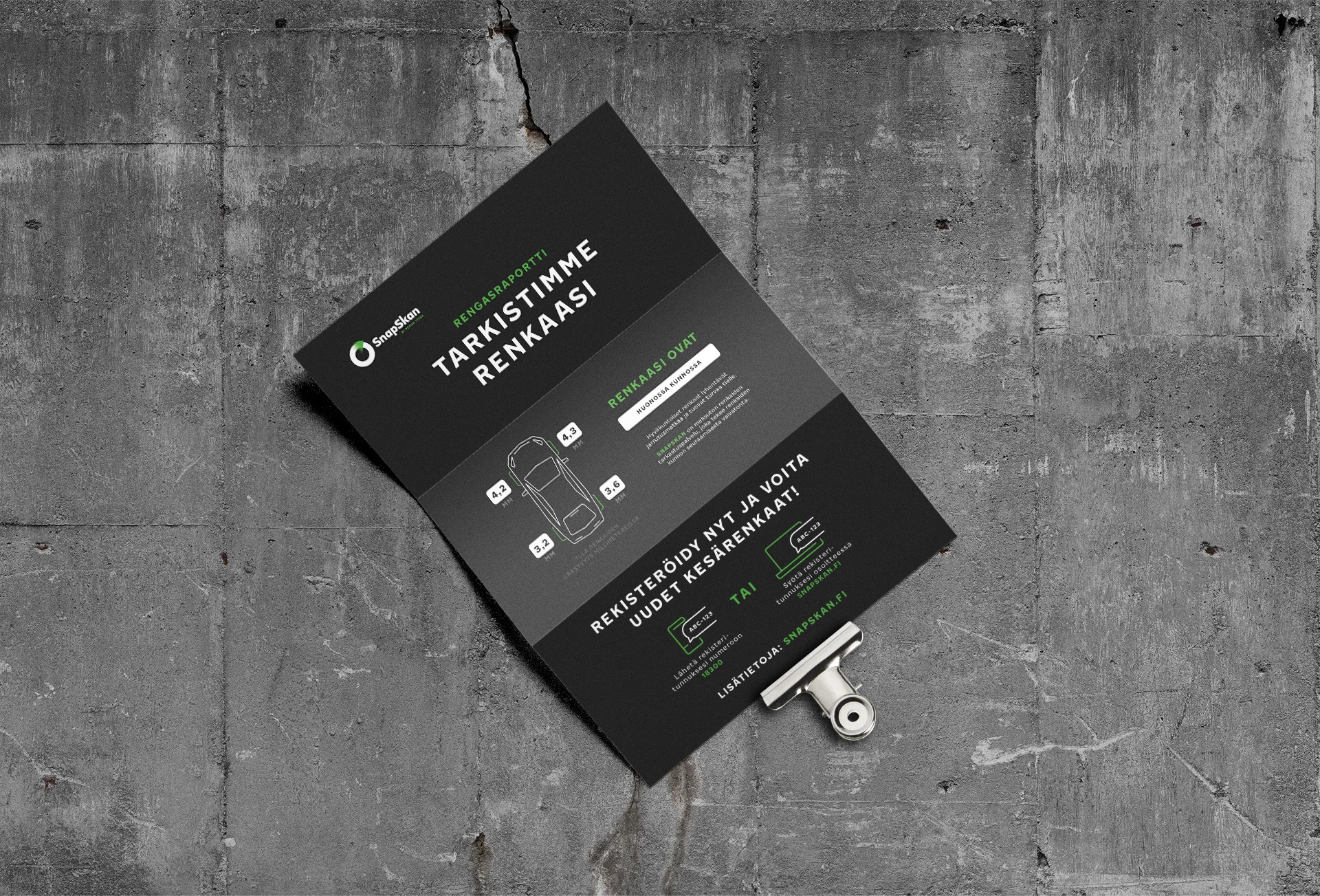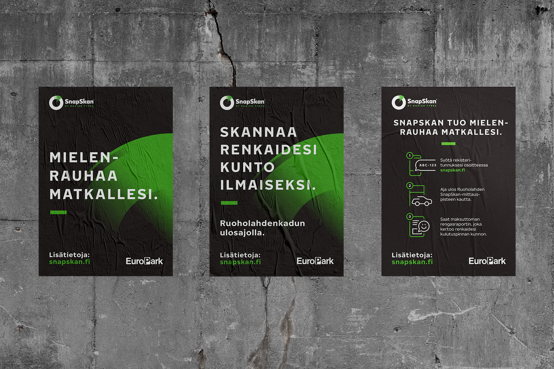 Snapskan is an automated tyre-safety service by Nokian Tyres that uses 3D scanning to measure tread depth and deliver instant condition reports to drivers. The service transforms routine driving environments into seamless safety checkpoints, making tyre checks effortless and accessible.